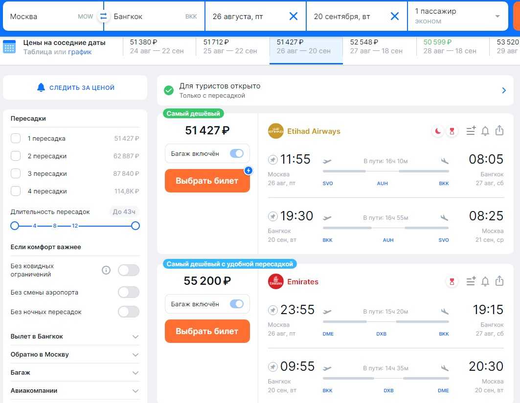 Из Москвы в Бангкок стоимость авиаперелета на одного человека составит примерно 50-55 тысяч рублей. При чем самый дешевый и самый быстрый практически не различаются по стоимости. Это все еще высокие цены, которые гораздо выше тех, что были пару лет назад, но все же приемлемые.