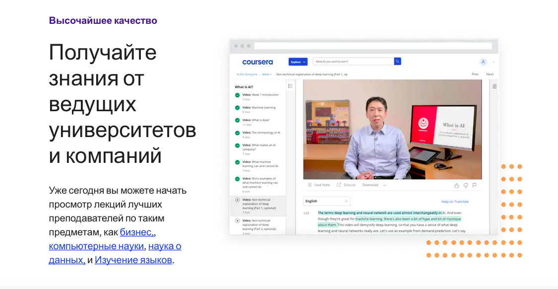 - Coursera – известный образовательный портал с сотнями онлайн-курсов от ведущих университетов и коммерческих учебных заведений из разных точек планеты. Многие курсы, а также лекции и другие образовательные материалы доступны бесплатно.