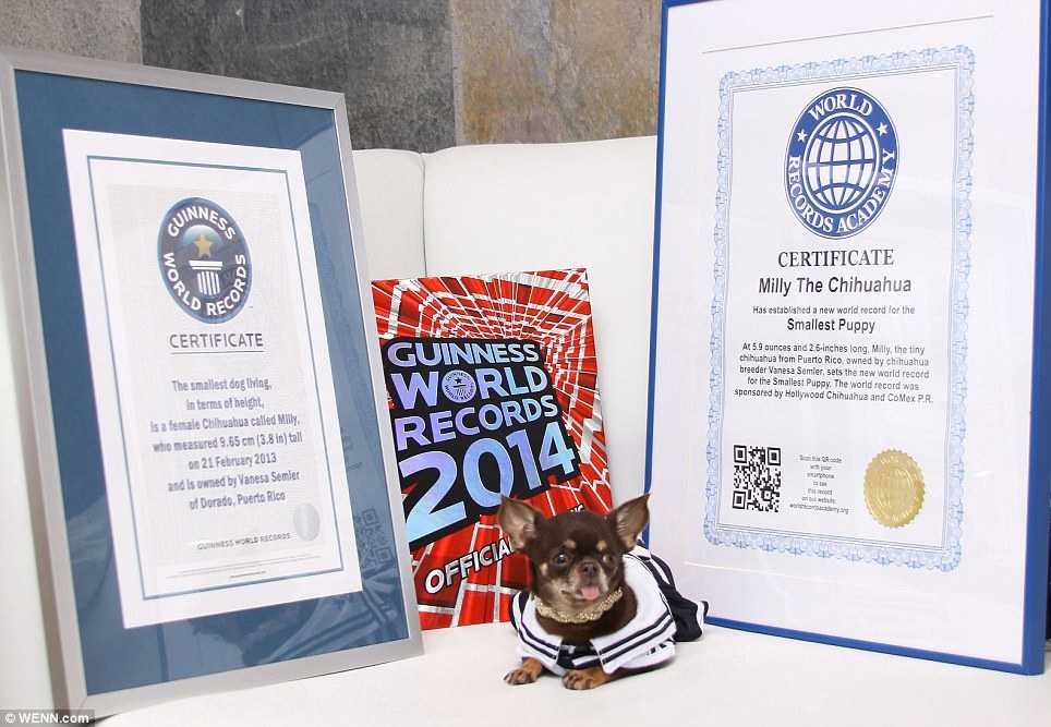 Известно, что чихуахуа — это самая маленькая порода собак в мире. А самая маленькая собака в мире (из всех чихуахуа), ростом менее 10 см — эта 4-летняя малышка по имени Милли, которая 21 февраля 2013 года была ростом в 9,65 см. Владельцы Милли, Ванеса Семлер и Эдвин Давила, рассказали, что эта крошечная собачка даже занесена в книгу рекордов Гиннеса.