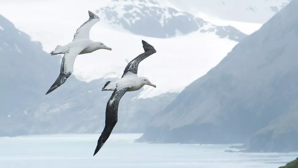 Пара альбатросов летит над заснеженными горами на острове Южная Джорджия в Антарктиде. (Изображение предоставлено: Getty Images)