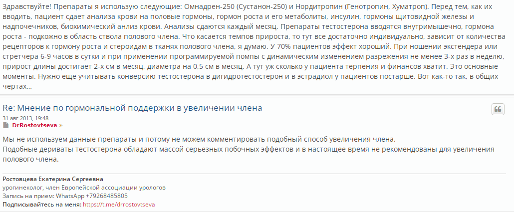 После пубертатного периода применение гормонов для увеличения члена бесполезно – к такому мнению склоняется большинство врачей. Но есть и те, которые ставят эксперименты над пациентами. Пример с форума https://uro-forum.ru/viewtopic.php?t=1875 (пациент перепроверяет ответ врача):
