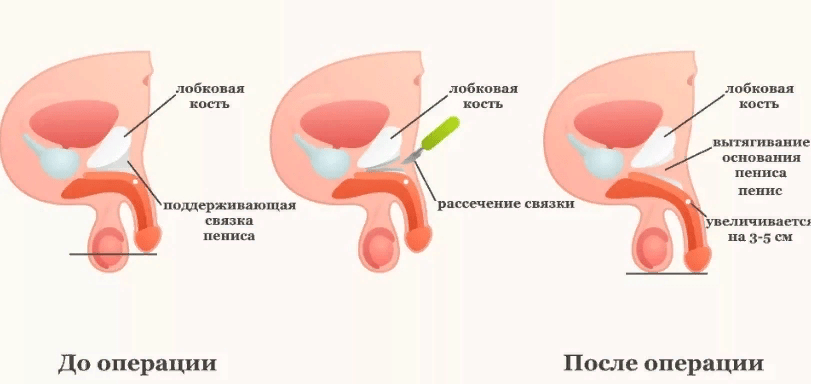- Лигаментотомия – удлинение пениса за счет подрезания лобковых связок. Сама операция даст прибавку в 2-4 см и последующее ношение экстендера может добавить еще столько же. Без него связки снова срастутся, эффект от операции пропадет.