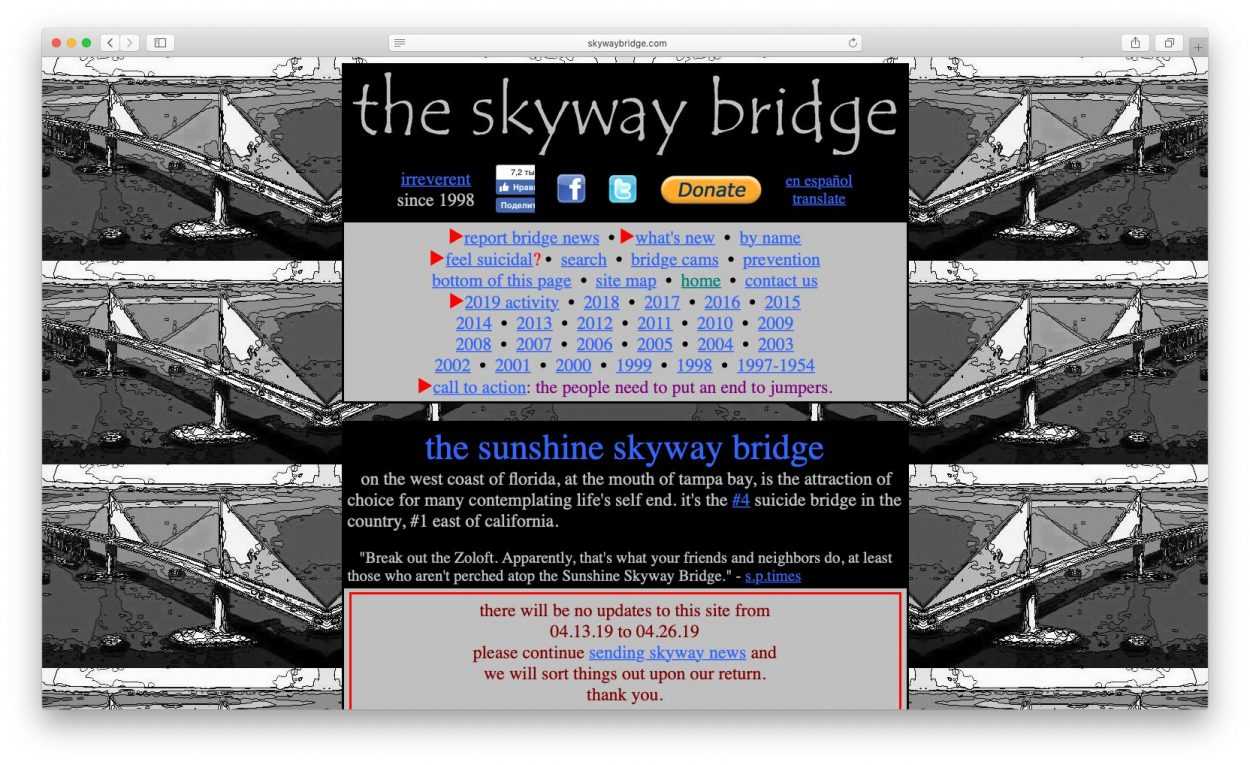 Мост Саншайн-Скайуэй имени Боба Грэма — уникальное творение инженеров и самое популярное место среди американских самоубийц. Те, кто решает свести счёты с жизнью, прыгнув с моста, по какой-то причине выбирают именно Саншайн-Скайуэй. Неудивительно, что появился даже специальный сайт, на котором ведётся подробная статистика суицидов, совершённых здесь. Больше всего пугает точность информации. Кто-то подсчитывает общее количество суицидов, выделяет из них число удавшихся или тех, что закончились не смертельно. Кроме того, сайт считает людей, которые пришли на мост, но так и не прыгнули. А ещё почти каждый прыжок сопровождается ссылкой на местные или федеральные газеты. Таким образом любой посетитель может узнать подробности и посмотреть фотографии с места происшествия.