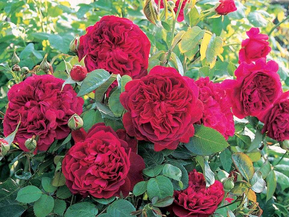 Сорт, имеющий схожесть с пионом, источает сильный запах. Розы Шекспира крупные, махровые, достигающие в диаметре 9 см. Собранные по 3-5 штук, представляют собой соцветия. Окрас может быть насыщенным красным и меняться к пурпурному.