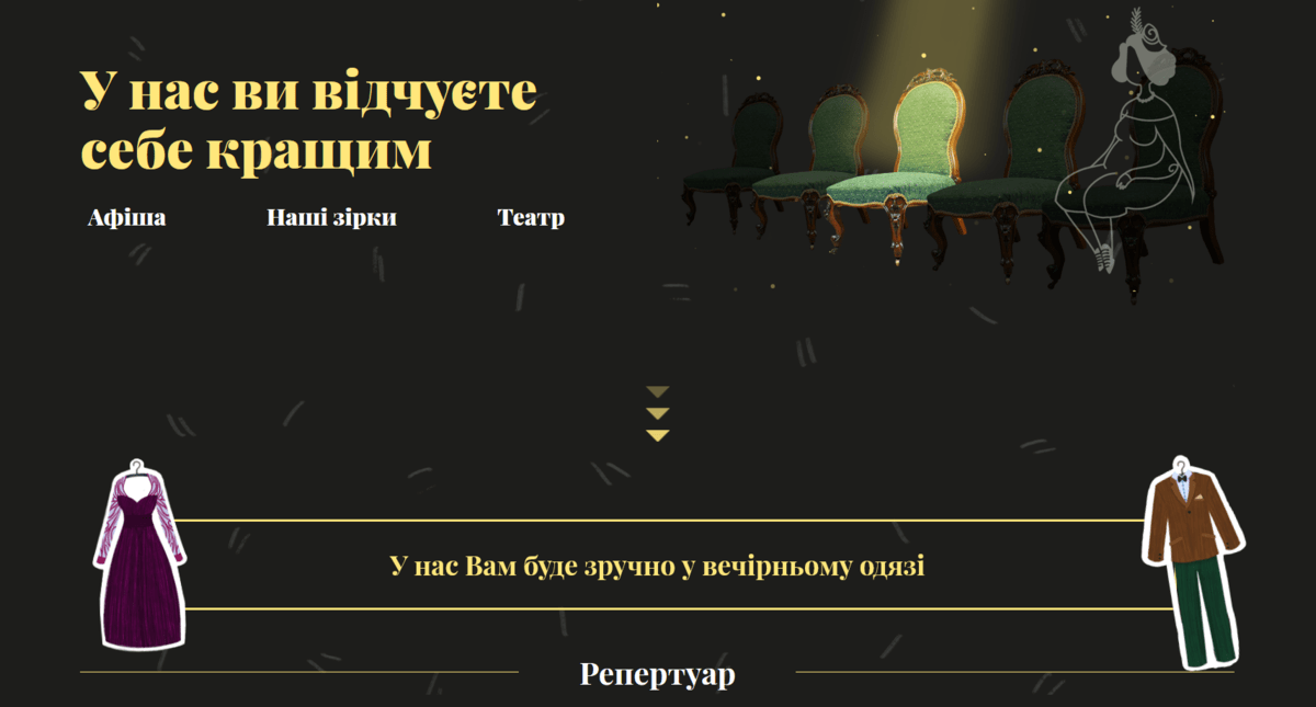 В разделе «Нашi зiрки» перед глазами по центру страницы предстает название театра, а по краям — нарисованные голубые кулисы. Прокручиванием мыши мы «раскрываем» кулисы, после чего на экране всплывает список актеров.