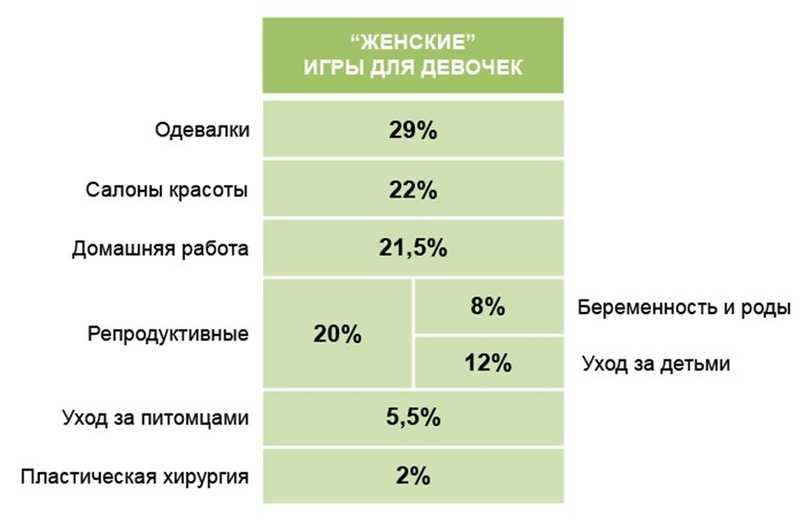До этого мы рассматривали игры, созданные в основном для взрослой аудитории. Но дети тоже играют, если даже не активнее взрослых. Особенной популярностью пользуются у них мобильные игры. А разработчики этих игр, пользуясь малым возрастом аудитории, штампуют очень похожие между собой игры. Основные темы игр для девочек — это макияж, подбор нарядов, уход за животными/детьми, готовка. В играх для мальчиков все гендерно ожидаемо – машинки, строительство, защита, войнушки, стратегии и разные аркады. Как и в реальных играх, мальчики могут быть строителями, гонщиками и в целом выбор игр для них шире. Для девочек уже рамки.