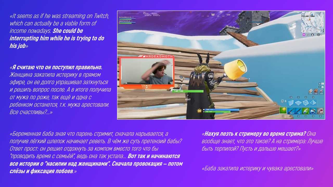Бьют геймеры женщин не только в играх, защищают право свое на насилие и в реальности. В начале этого месяца игрок избил свою беременную жену во время своей онлайн трансляции на Twitch, ведь она отвлекала его от игры тем, что позвала на обед. Его арестовали. Но на этом история не заканчивается. В поддержку «спровоцированного» «добытчика» семьи были написаны сотни комментариев, обвиняющие его жену.