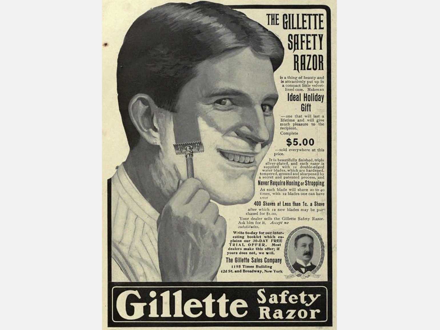 Создатель компании Gillette ― Кинг Кэмп Жиллетт в 1901 году придумал и запатентовал Т-образную безопасную бритву с одноразовыми тонкими лезвиями. Гребень бритвы можно было открыть, чтобы заменить затупившееся лезвие на новое. До этого времени качественно и безболезненно выбрить лицо мог только цирюльник, и не у всех мужчин была возможность обратиться к ним. Жиллетт превратил бритьё в простую гигиеническую процедуру, доступную каждому. В 1915 году Жиллетт пошёл в своём маркетинге ещё дальше и выпустил станок для женщин.