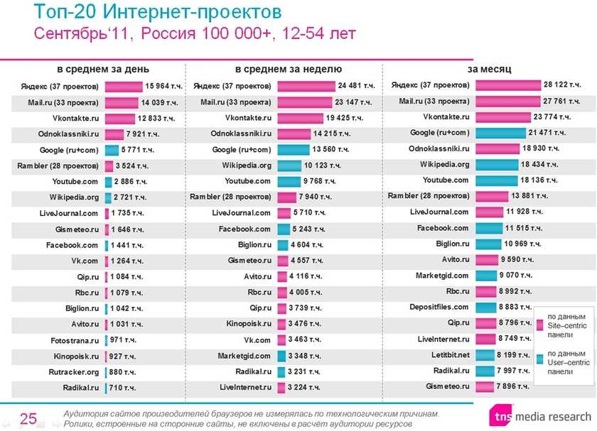 Несколько интернет-проектов рунета обошли крупнейшие российские телеканалы по охвату аудитории 12–44 лет в крупных городах России (с населением более 700 000 человек; 700+). Эти данные «Ведомости» получили от одной из интернет-компаний, их подтвердил представитель TNS. Это данные TNS за июнь 2016 г., в которых учтена как мобильная аудитория рунета (те, кто заходит на сайты с мобильных устройств), так и традиционная (с ПК и ноутбуков).
