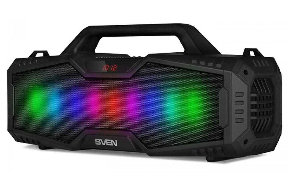 Корпус SVEN PS-480 оснащен светодиодным дисплеем, на который выводятся все установленные настройки. Регулировка происходит кнопками в верхней части. Там же можно поймать любимую радиоволну благодаря FM-тюнеру. Сделана система из прочного АБС пластика черного цвета.