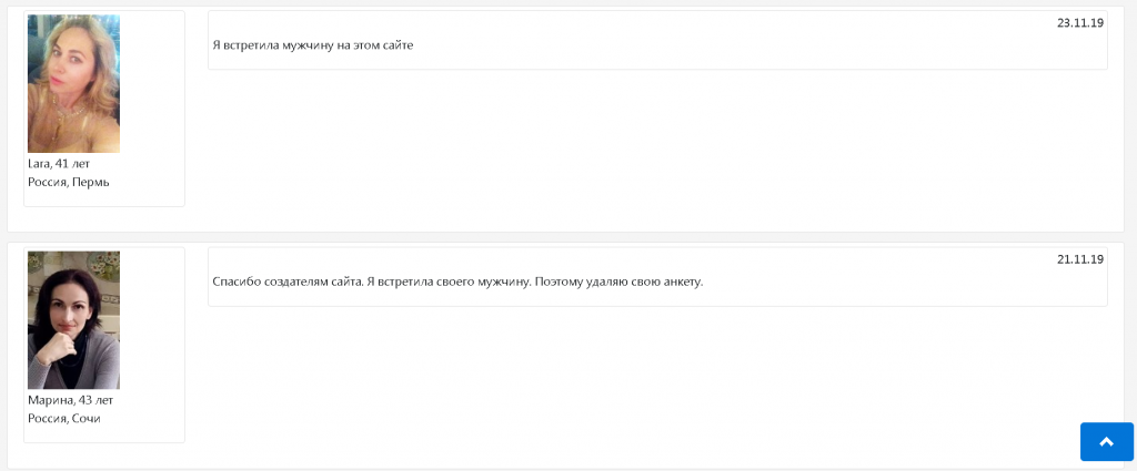 Дарья, 52 года.У меня был опыт общения с мужчинами посредством сайтов знакомств, но все заканчивалось расставаниями, которые я переживала очень болезненно. Я пробовала наладить отношения на многих площадках, но, на мой взгляд, там мало достойных кандидатов. Сейчас я пользуюсь Free-russian-dating.net. Здесь меня все устраивает: большой каталог «претендентов», расширенные параметры поиска, а психологическое тестирование поможет определить степень совместимости.