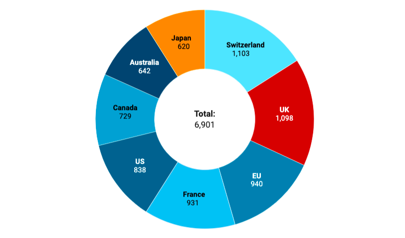 По информации базы данных Сastellum, больше всех санкций ввели Швейцария – 1 103, Великобритания – 1 098, Евросоюз – 940, Франция – 931, США – 838. Всего около 6 901 от разных государств.