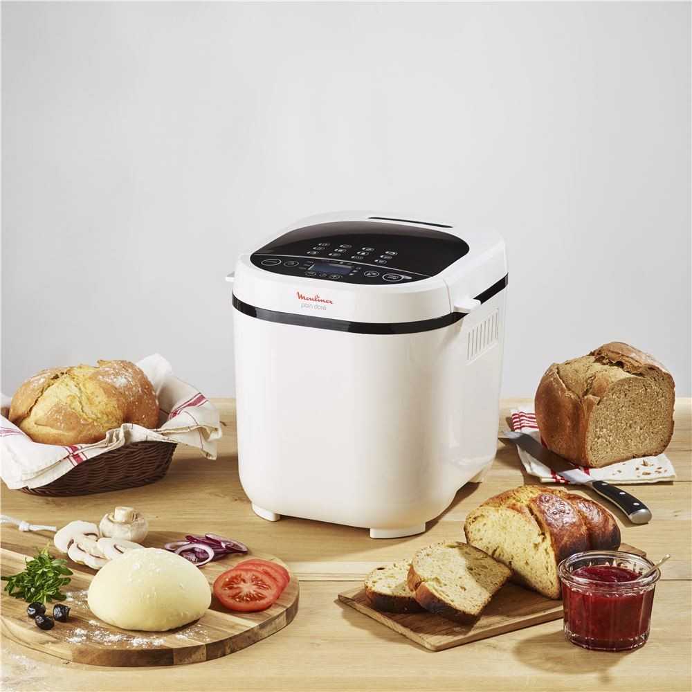 650-ваттная хлебопечка для дома от Мулинекс, согласно опросу пользователей – лидер продаж. Это самая популярная модель многофункционального кухонного прибора, поддерживающего целых 20 программ. Устройство может готовить сладкую и бездрожжевую выпечку, варенье и джемы, месить тесто. Ускоренный режим выпечки выручает, когда нужно быстро испечь хлеб. С помощью хлебопечки удается своими руками сделать французский багет и безглютеновую выпечку, испечь кексы, пшеничный или бородинский хлеб.
