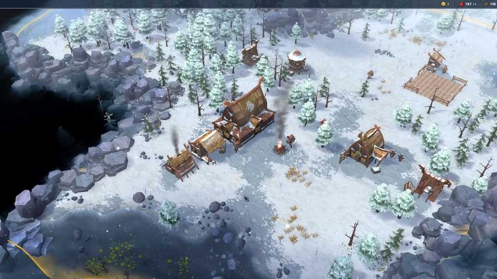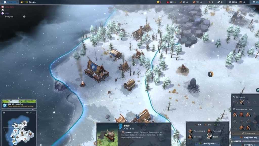 До второй зимы также желательно получить и титутл тана и если склады уже открыты можно временно перевести морячков на добычу славы. Вдобавок для ускорения запустить пир (+20) и не забывайте, что каждая технология и новая территория это еще по плюс 20 славы. С полученных ресурсов первым делом улучшаем ратушу, но в запасе останется еще куча золота еды и древесины, поэтому полезно сделать это до второй зимы, особенно если ожидается метель. Если с колонизацией волчьих нор не повезло, тогда об остальных улучшениях забываем надолго, в противном случае можно грейдануть один домик.