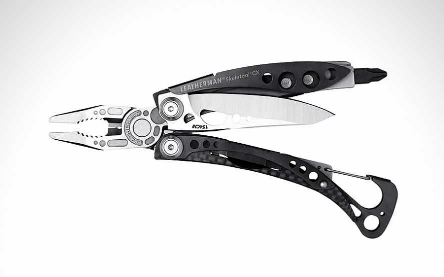 Дизайн корпуса минималистичного мультитула Leatherman Skeletool CX соответствует его имени. Облегченная конструкция сделала его довольно востребованным инструментом. Еще одним преимуществом является изготовленный из нержавеющей стали 154CM полноценный нож, который по качеству превосходит лезвия большинства мультитулов. И, несмотря на небольшой размер, в Skeletool CX имеется кернер. Изделие весит всего 142 грамма, что удобно при ношении. Среди его инструментов есть кусачки, плоскогубцы и карабин, который выступает еще и в роли открывалки для бутылок. Карабинный зажим можно также использовать для крепления к рюкзаку, чтобы было проще носить его с собой. Все функции, за исключением пассатижей, доступны без открывания всего инструмента.