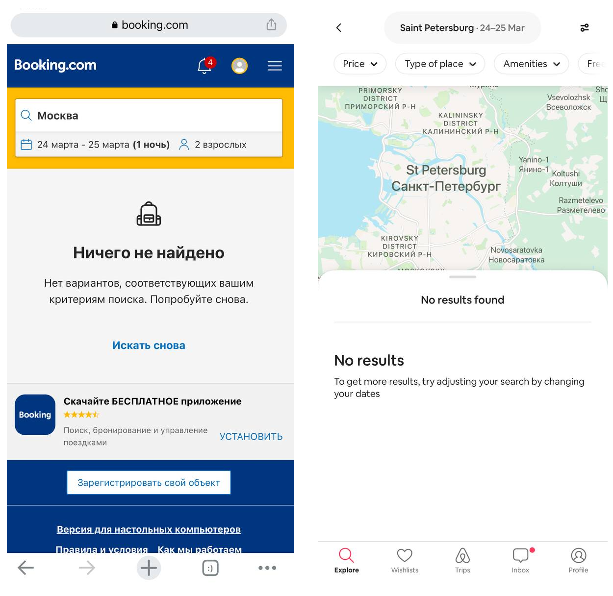 4 марта «Букинг» и «Эйрбиэнби» приостановили работу с российскими и беларускими объектами размещения. 4 апреля «Эйрбиэнби» объявила о том, что гости из России и Беларуси «больше не смогут оформить бронирование где бы то ни было». А все оплаченные бронирования после 4 апреля отменены, а деньги вернули в виде бонусов. Только как тратить эти бонусы при условии, что граждане России и Беларуси не могут пользоваться сервисом — непонятно. Хотя компания обещала, что это не коснется жилья, которое забронировали до 4 марта — даты официального уведомления о приостановке работы.