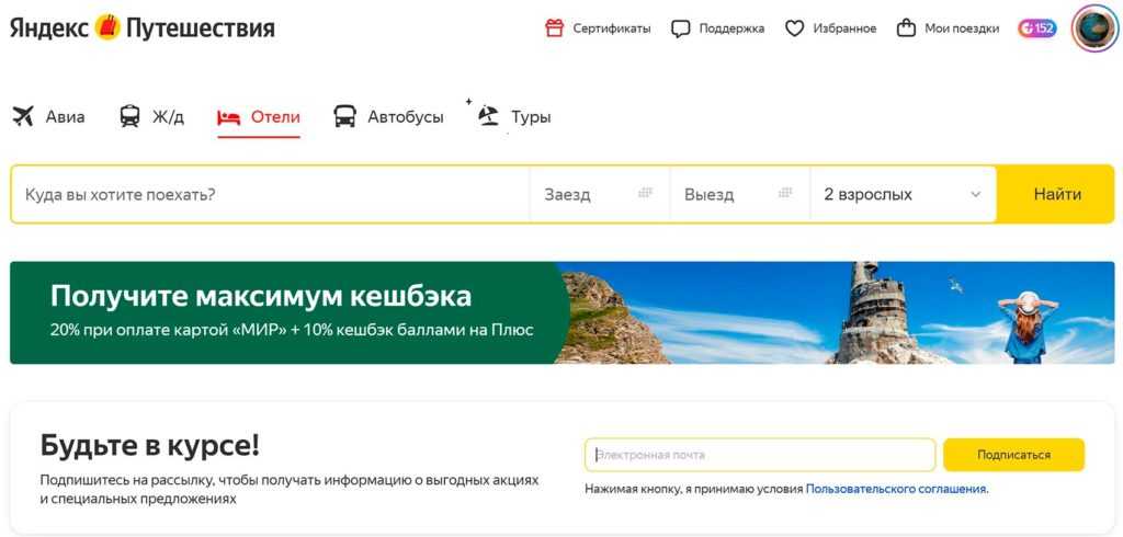 При бронировании отеля вам будут начисляться 10% баллами Яндекс.Плюс. Их можно потратить в экосистеме Яндекса, например, на подписку в Кинопоиске или при заказе такси. Регулярно проходят и другие акции с дополнительным кэшбэком. Например, сейчас дают 10% за подписку на новости. Все скидки для Яндекса собираем здесь.