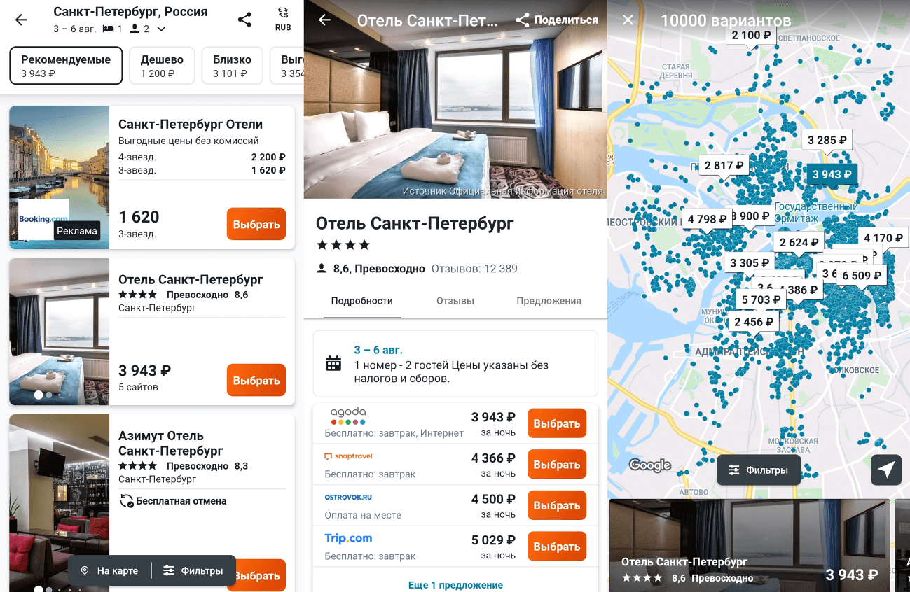 Этот cервис предлагает бронирование отелей или хостелов и в России, и за рубежом. В базе поисковика — более двух миллионов вариантов размещения. Кстати, здесь же можно купить билет на автобус, поезд, самолёт, арендовать авто или подобрать экскурсию.