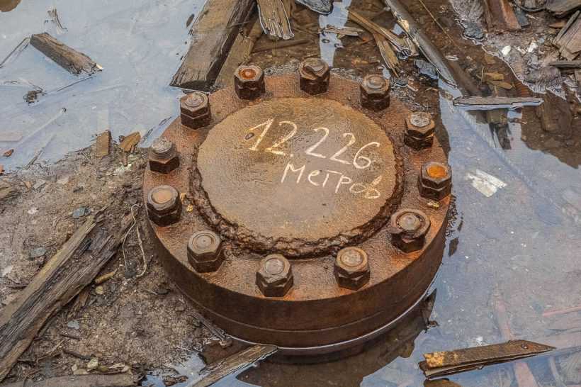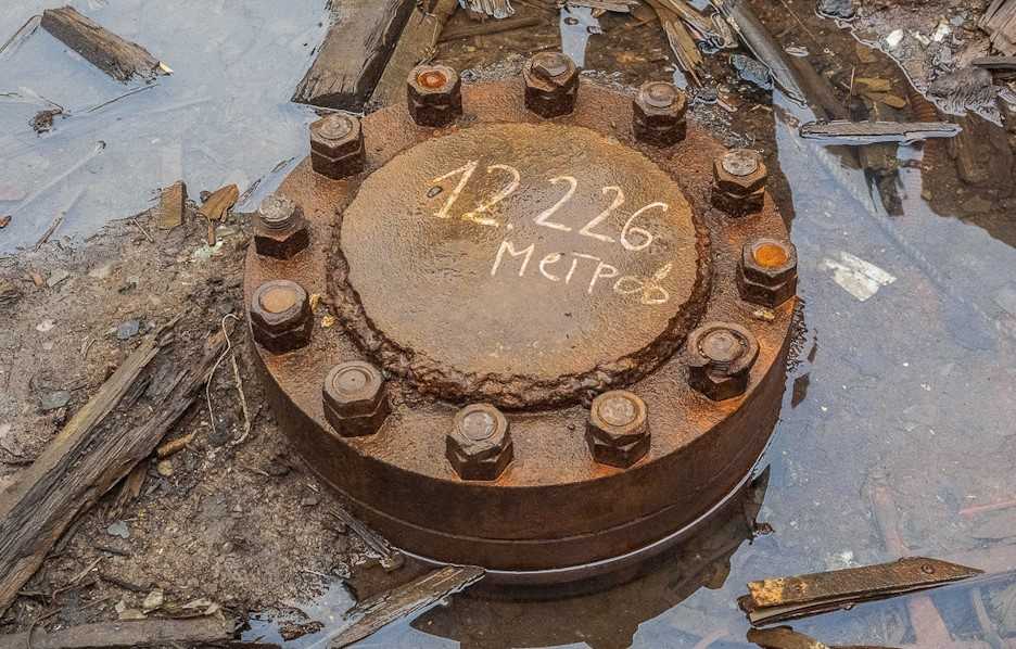Подойдя к скважине сегодня, мы увидим лишь верхнюю часть — металлический люк, привинченный к устью двенадцатью массивными болтами. Надпись на нем сделана с ошибкой, правильная глубина — 12 262 метра.