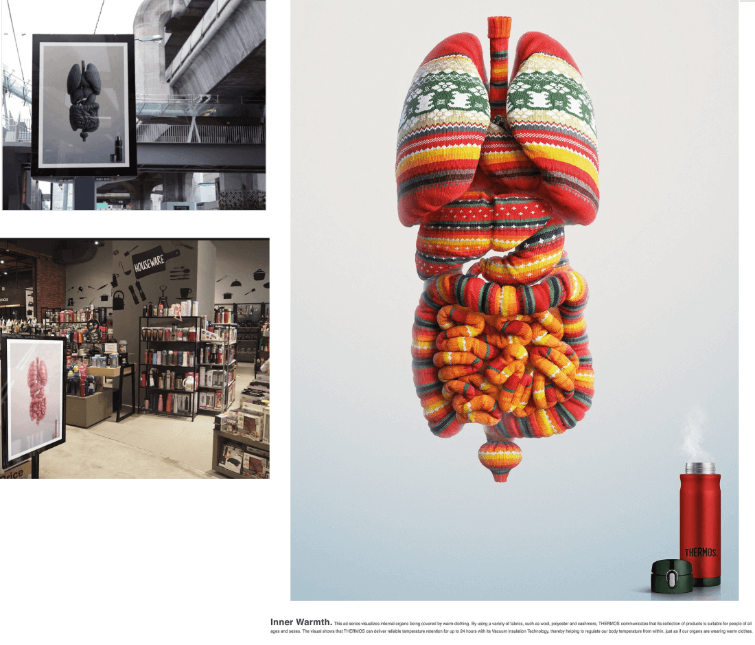 Thermos разместил в Таиланде серию наружной рекламы о внутреннем тепле (Inner Warmth), которая показывает, как внутренние органы сохраняют тепло в одежде из разных тканей. Термосы помогут это тепло передать и сохранить.