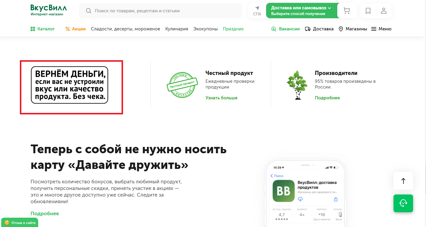 Магазин «Вкусвилл» на главной странице указывает, что вернет деньги, если у покупателя возникнут претензии ко вкусу и качеству, даже чек не понадобится