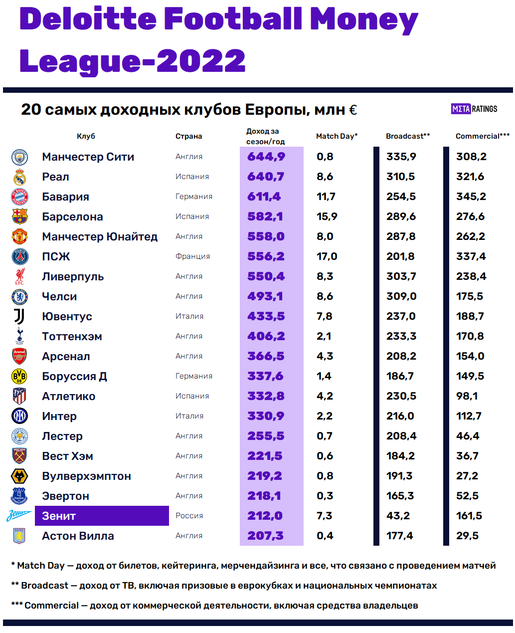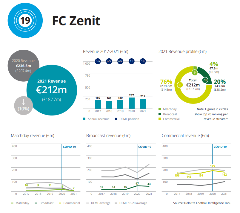 «Зенит», самый богатый клуб России, оказался на 19-м месте рейтинга с доходом в 212 млн евро. Из-за особенностей сдачи бухгалтерской отчетности в России финансовые показатели петербургского клуба чуть отличаются от других. Если у европейских клубов указан доход за сезон 2020/21, то у «Зенита» — за 2020 год.