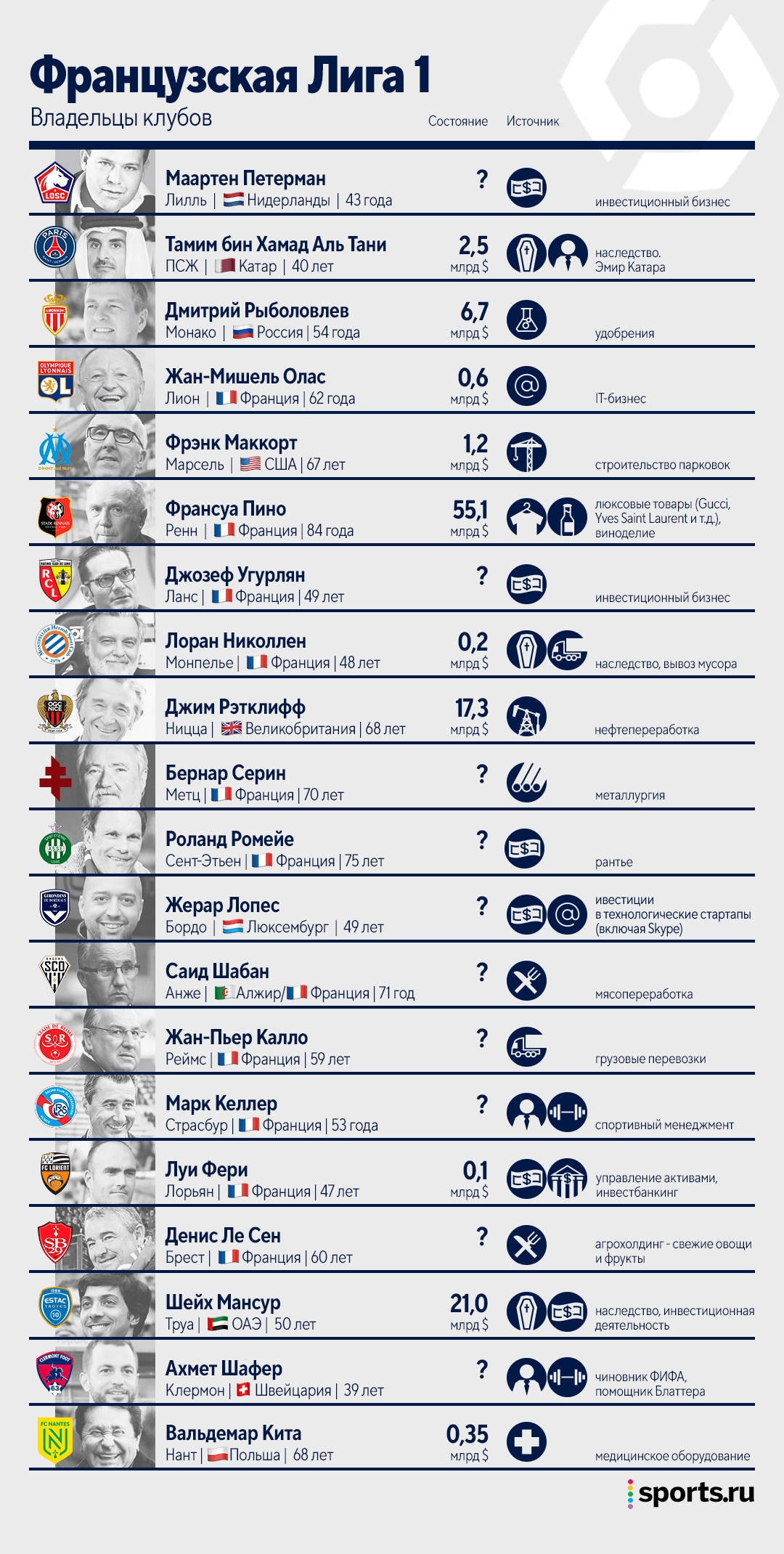 Многие владельцы французских клубов сделали деньги в сырьевом секторе. Хотя Франция не относится к числу нефтяных гигантов, тут сразу два представителя этого сектора: богатейший британец Джим Рэтклифф, которому принадлежит «Ницца», и азербайджанец Хафиз Маммадов из «Ланса».