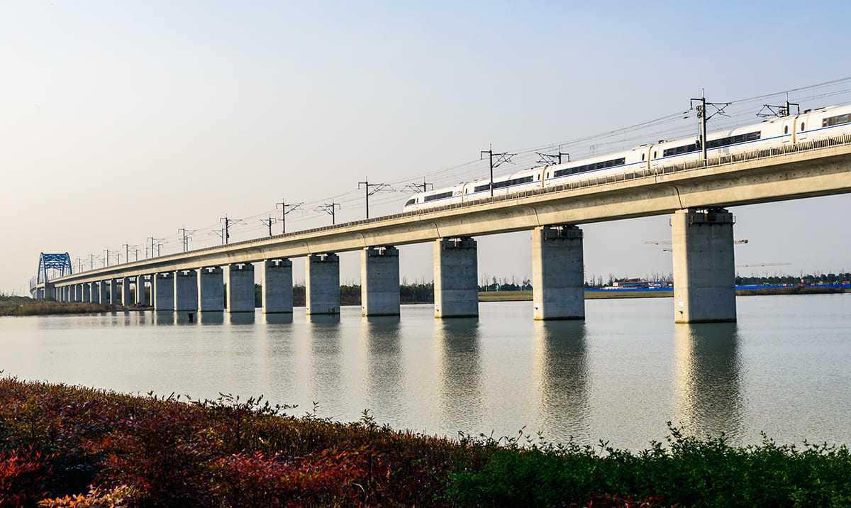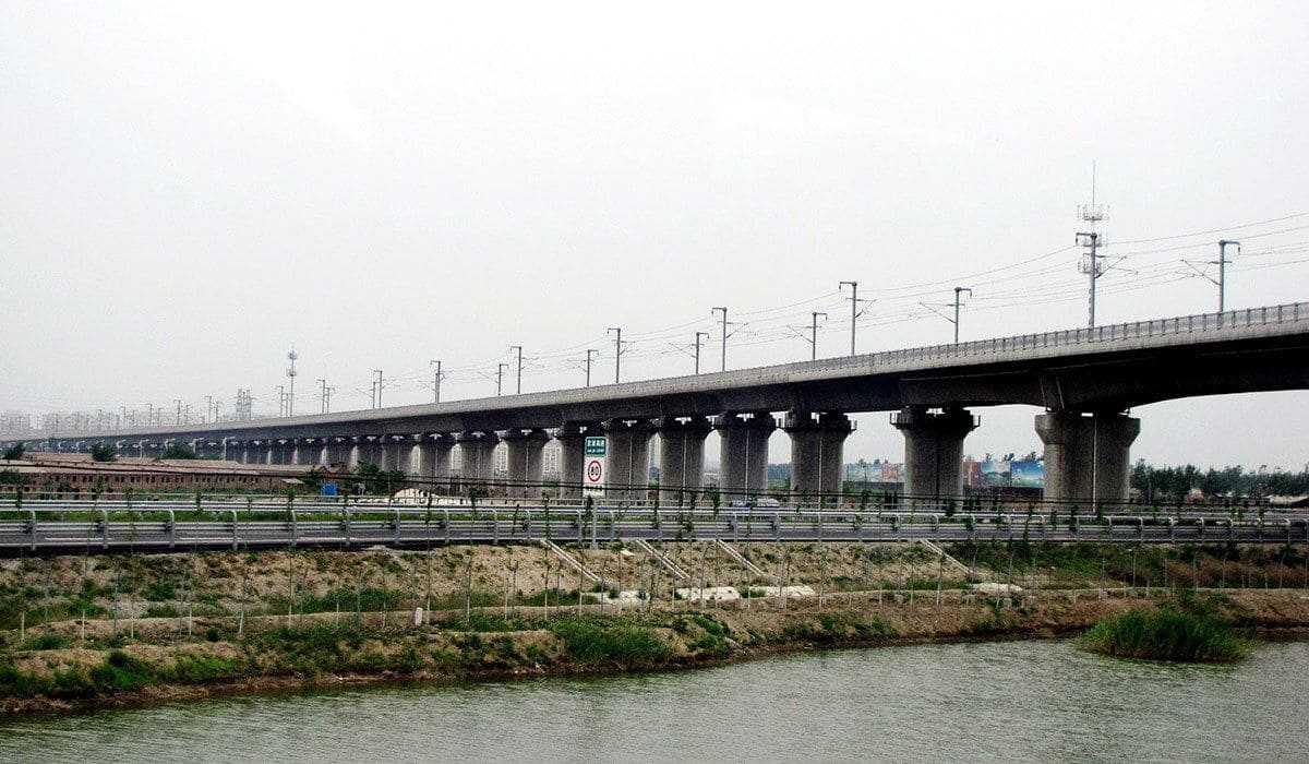 Железнодорожный мост на пути из Пекина в Шанхай. Он отвечает современным требованиям безопасности, поскольку на этом участке проезжает скоростной поезд, двигающийся со скоростью свыше 300 километров в час. Открыт в 2010 году, протяженность — 114 м.
