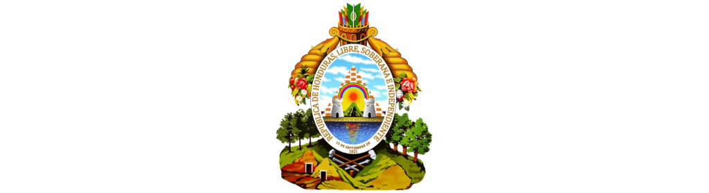 Итак, в центре герба вместо щита расположен овальный медальон, по краю которого вьется надпись — «Республика Гондурас, свободная, суверенная и независимая. 15 сентября 1821». Внутри медальона изображены основные гербовые символы — равнобедренный треугольник, в основании которого изображены два замка и между ними вулкан. Над замками встает солнце в окружении радуги.
