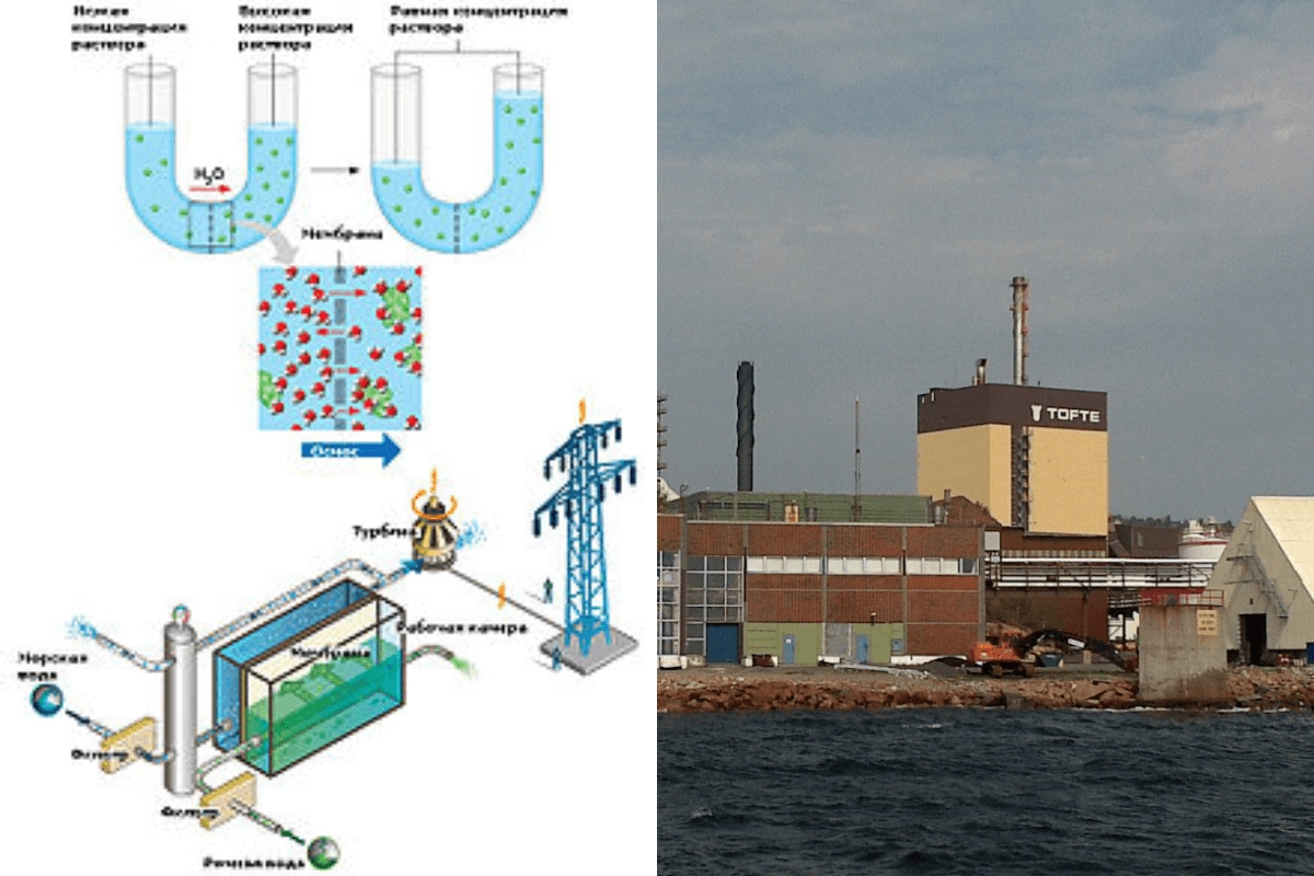 Один из недавно открытых, однако вполне себе перспективных источников возобновляемой энергии: осмотические электрические станции строят в устьях рек с целью извлечения энергии из энтропии жидкостей во время взаимодействия пресной и соленой воды. Дело в том, что когда солевая концентрация выравнивается, заявляет о себе избыточное давление — оно-то и приводит во вращение лопасти турбин. Так как направление новое, осмотическая станция сегодня одна на всю планету — находится в Норвегии.