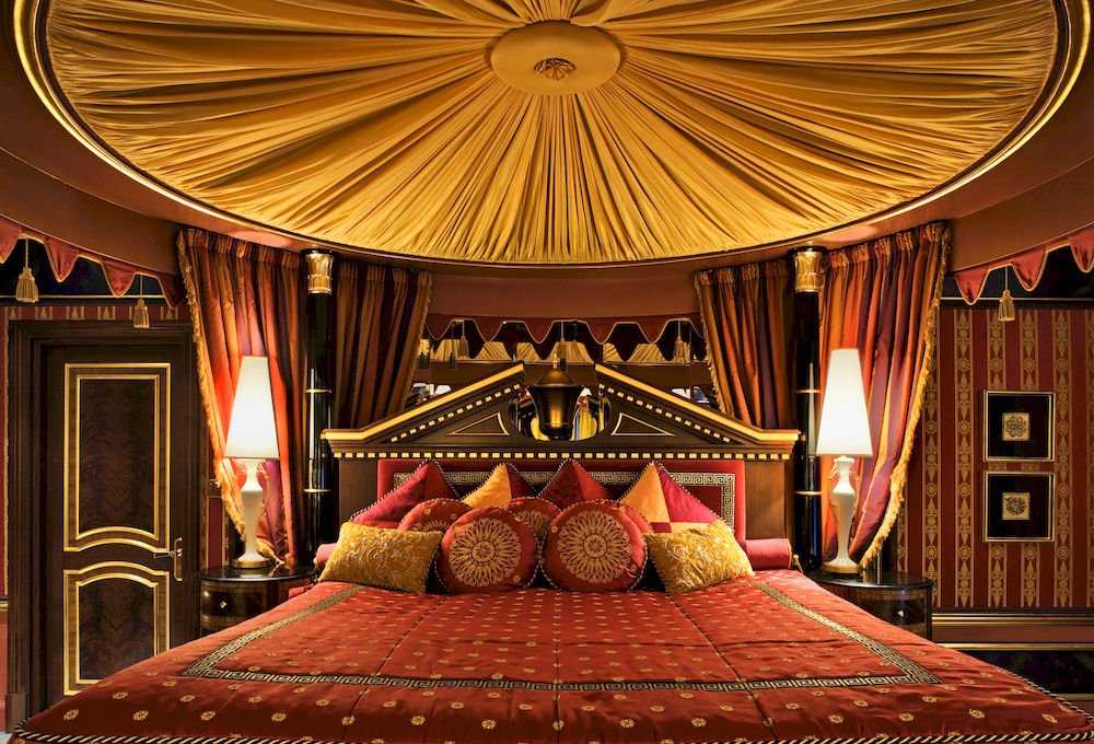 Этот номер ослепителен в прямом смысле этого слова: практически все поверхности в нем выполнены из желтого золота высшей пробы, даже телевизор. На нужный этаж можно попасть при помощи личного лифта, а затем пройдя через персональный холл. Площадь трех комнат – двух спален и кабинета – 780 кв. м, а стоимость суточного пребывания – $20 000 или 1,3 млн рублей. Помимо красот, в стоимость входят услуги дворецкого, возможность поиграть в теннис на крыше на высоте 321 метра над уровнем океана, а также вертолётные прогулки и личный пляж.