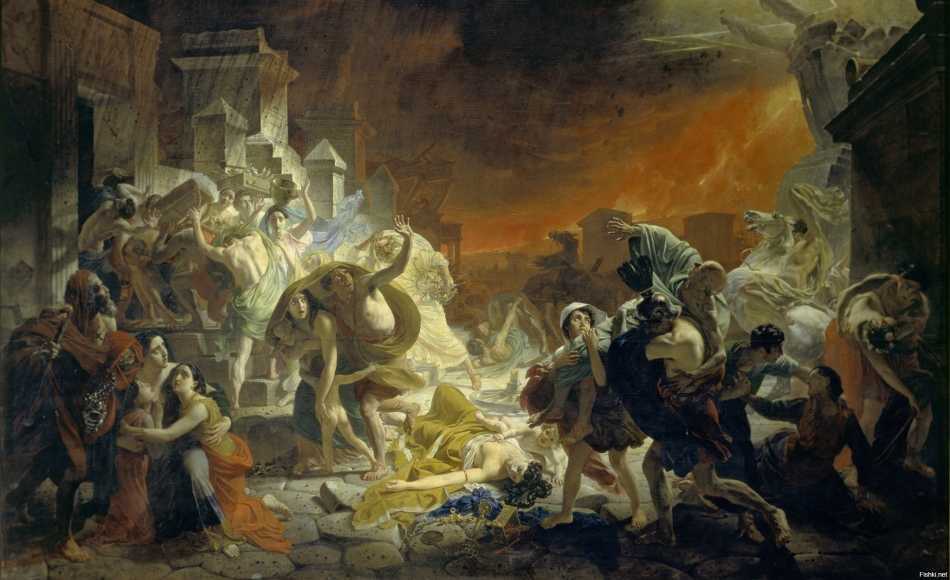 «Последний день Помпеи» Карла Брюллова, 1833 года. На написание картины художника подвигли развалины Помпей. Он побывал на раскопках этого погибшего городка, и увиденное произвело на него неизгладимое впечатление. Он несколько лет вынашивал внутри себя идею воссоздать на полотне картину гибели людей вместе со своим городом. Карл Брюлло решил сделать полотно крупноформатным, и потратил на это целых 6 лет. Очень много? Да, времени ушло предостаточно, но когда картина увидела мир, все были поражены ее реалистичностью. И даже по истечению времени, она продолжает поражать людей своей мощной энергетикой.