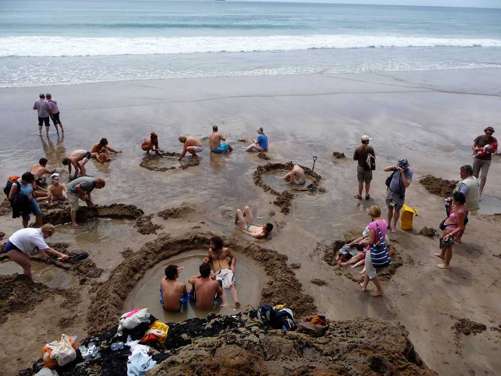 В самый разгар пляжного сезона, многие семьи приходят на пляж с лопатами, чтобы расслабиться всей семьей в геотермальной воде. Принцип работы таков, чем глубже будет вырыта яма, тем горячее будет в ней вода. Если вода слишком горячая, то ее можно разбавить с водой из океана, поэтому такие источники лучше создавать ближе к берегу