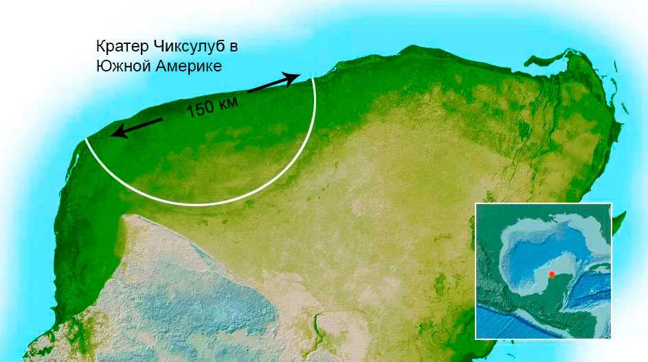 Кратер Чиксулуб в Южной Америке, примерно совпадает по размерам с тем, что оставил бы наш гипотетический метеорит при столкновении с Землей