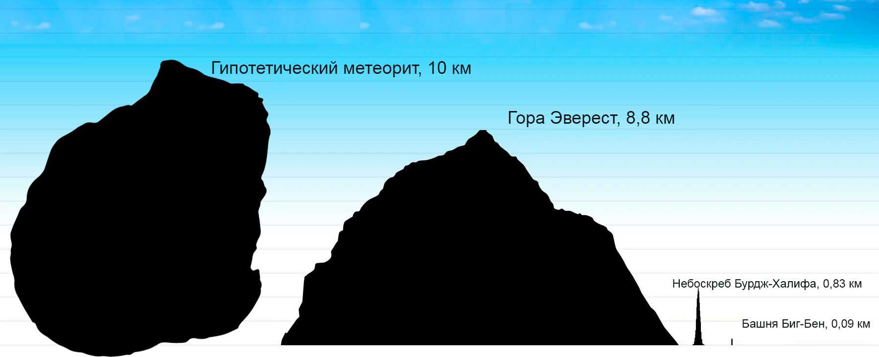 Сравнение размеров метеорита диаметром 10 км и горы Эверест
