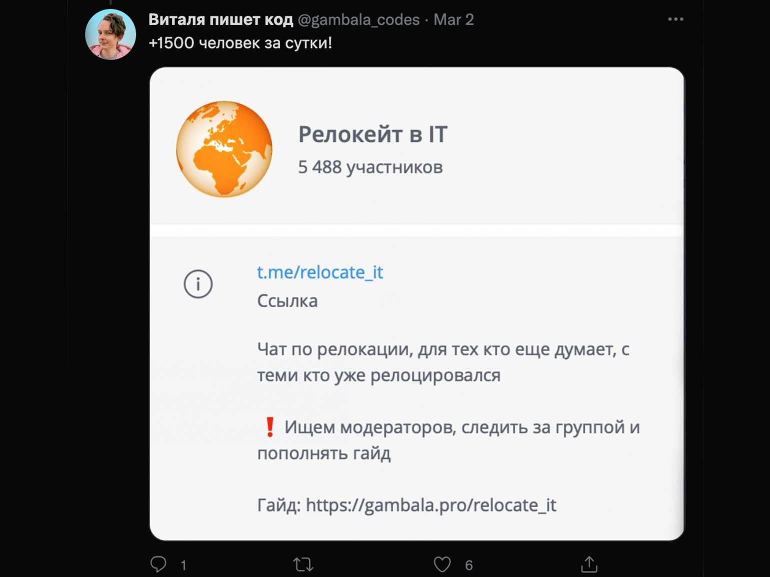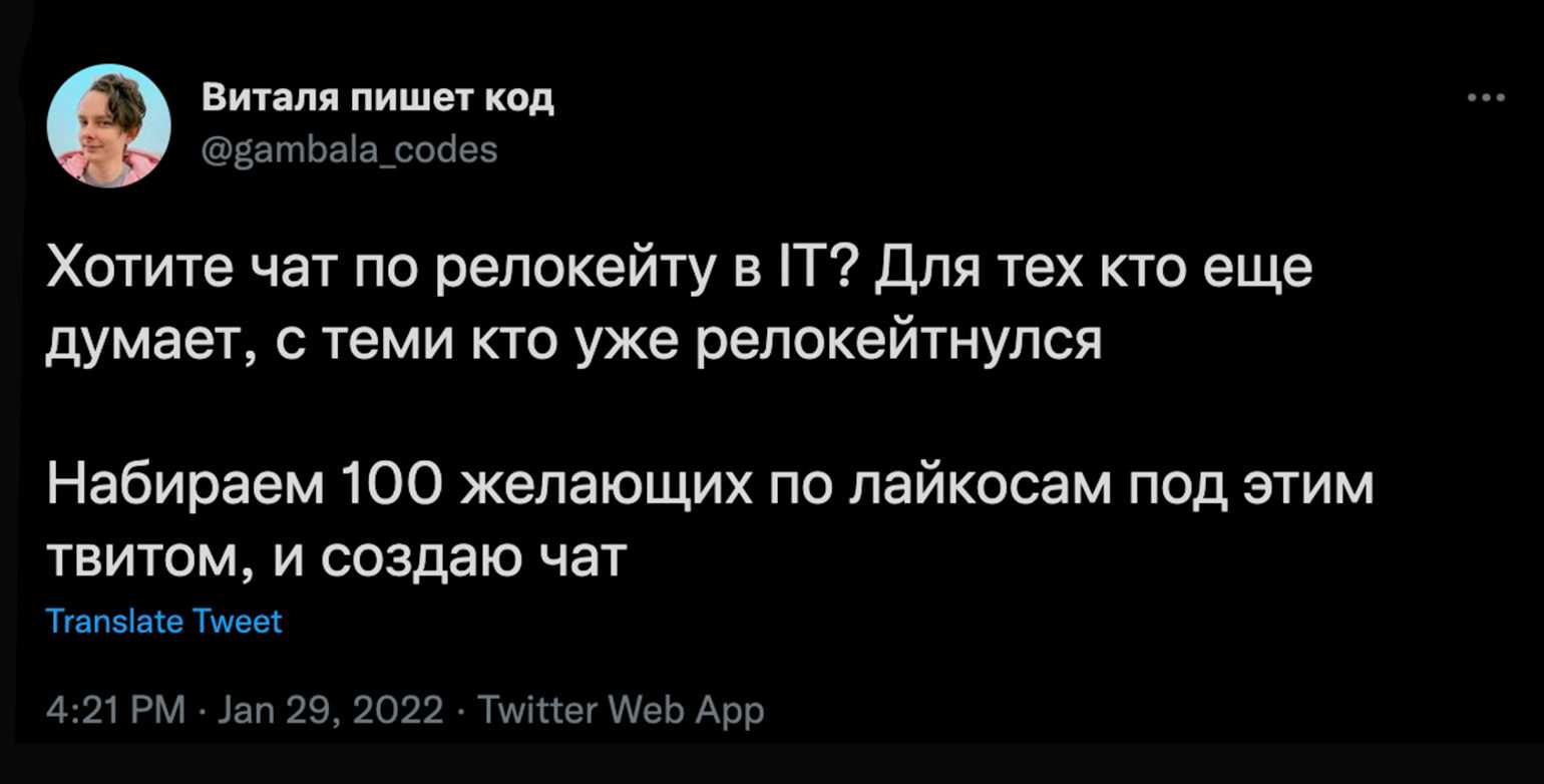 Воплотить замысел мне удалось месяц назад. Я спросил у подписчиков в Twitter, нужен ли им чат по релокации. Твит собрал 100 лайков меньше чем за час, и я создал чат в Telegram и опубликовал ссылку на него — так пришли первые 500 участников.