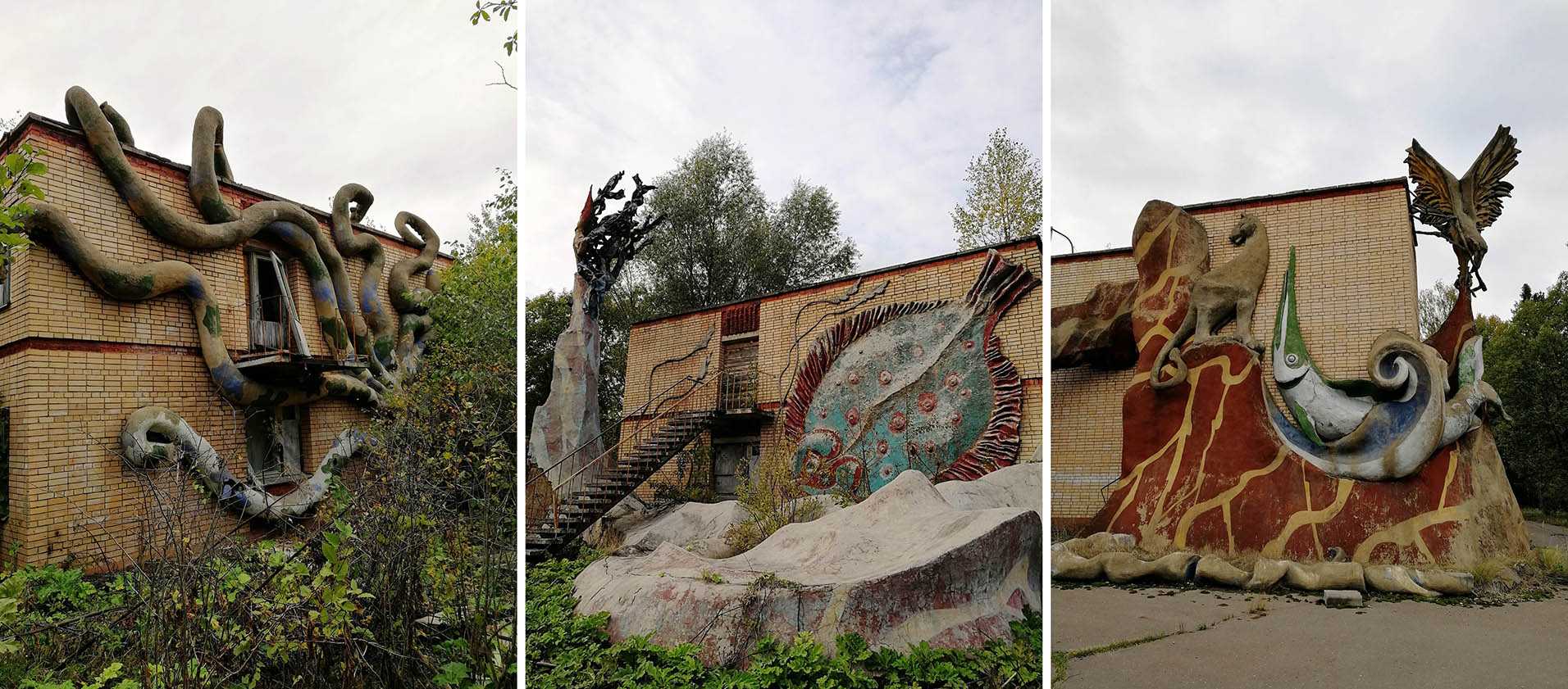 Детский лагерь «Сказка», расположенный на севере Подмосковья – это гимн сюрреализму по-советски. Вероятно, в своем первоначальном виде, он был весьма необычным и привлекательным для своих юных постояльцев. И экстерьер, и интерьер корпусов, оформленный в морской тематике, при первом рассмотрении удивляет до отвисания челюсти. При более детальном – завораживает. Детей – буйством красок и разнообразием представителей флоры и фауны, а взрослых – текучестью форм и аллегоричностью сюжетов.