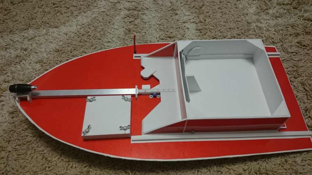 - На корме крепятся рейки, на которые устанавливают двигатели, антенну и систему управления. Двигатель с дном корабля должны образовывать угол 10 градусов.