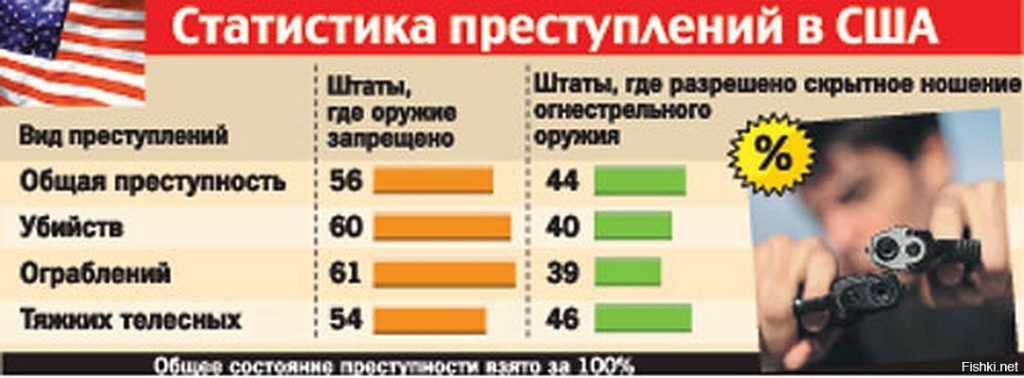 В штатах со строгими законами с 1977 по 2014 год снизилась на 42%. Тогда как в штатах с простой регистрацией – 9%. Вооружение населения ведет к настоящей гонке. В следствии того, что бандиты понимают возросшую опасность и увеличивают арсенал.