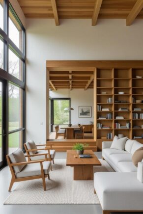- Пропорции: Диван — не больше 2/3 стены, столик — на 50–60 см ниже дивана. Полки до потолка экономят место.